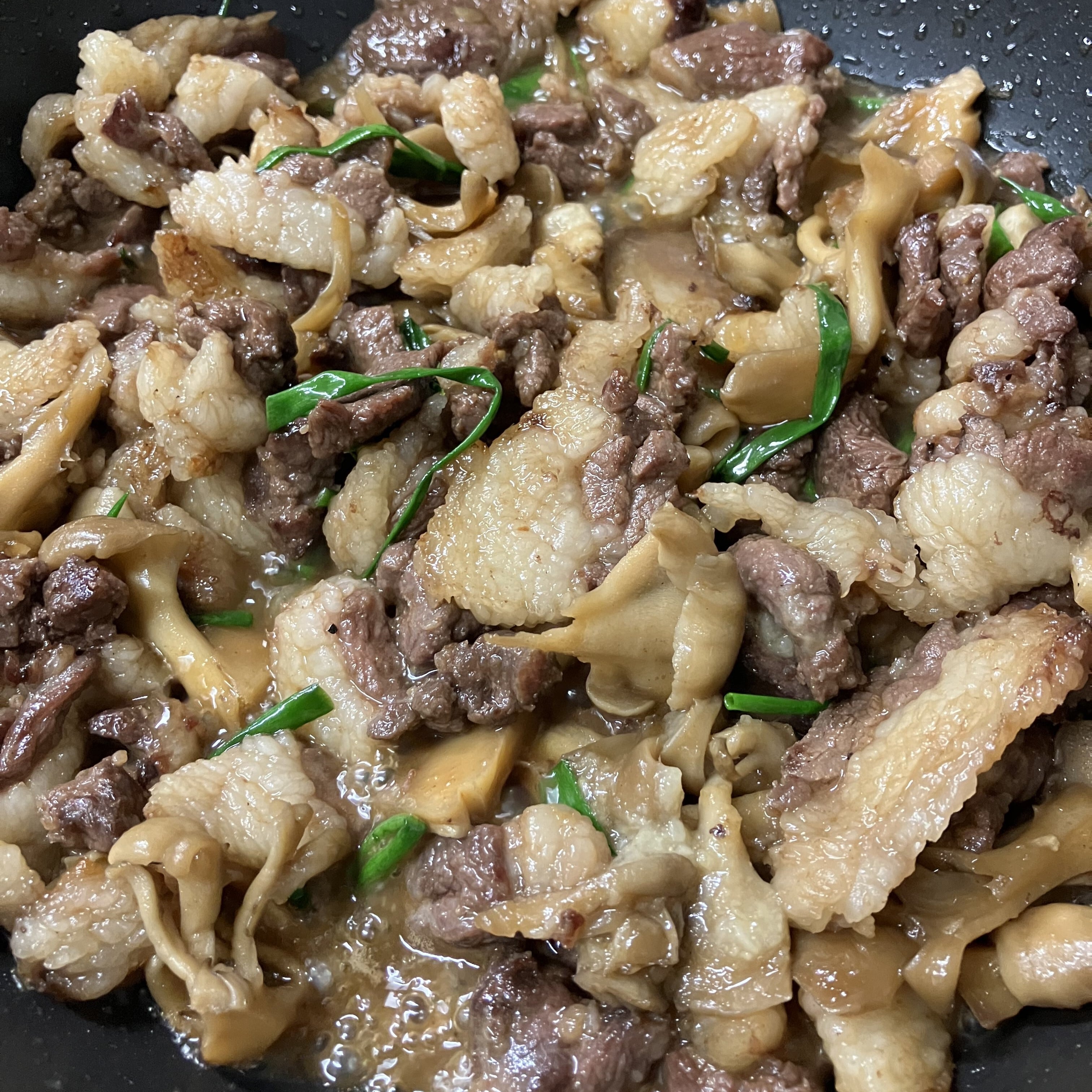 ☆【アナグマ肉と舞茸の醤油炒め】:アナグマの脂でアナグマ肉を焼く→舞茸、ネギ、酒、醤油、砂糖、生姜を入れて炒める。